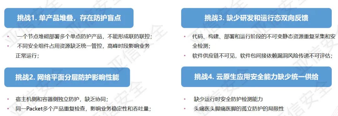 综合来讲,由于应用程序安全性和基础设施安全性已经成为一体,基于分层理念的单点能力组合式云安全产品方案,与算力云采用的云原生技术架构带来的各层之间模糊化,产生了结构性矛盾。