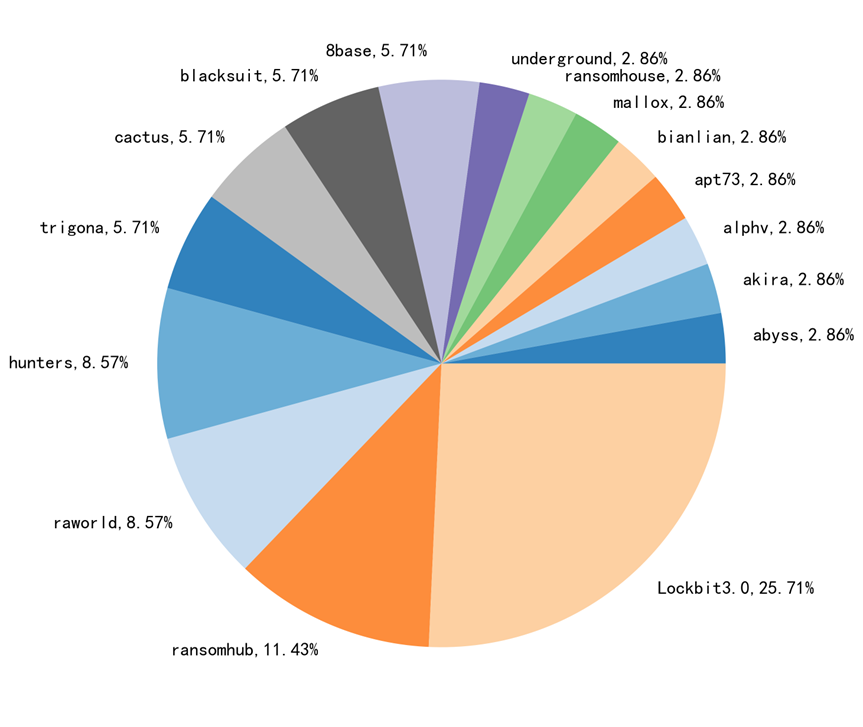 图1.7 2023年下半年至今攻击中国区域的勒索家族分布图