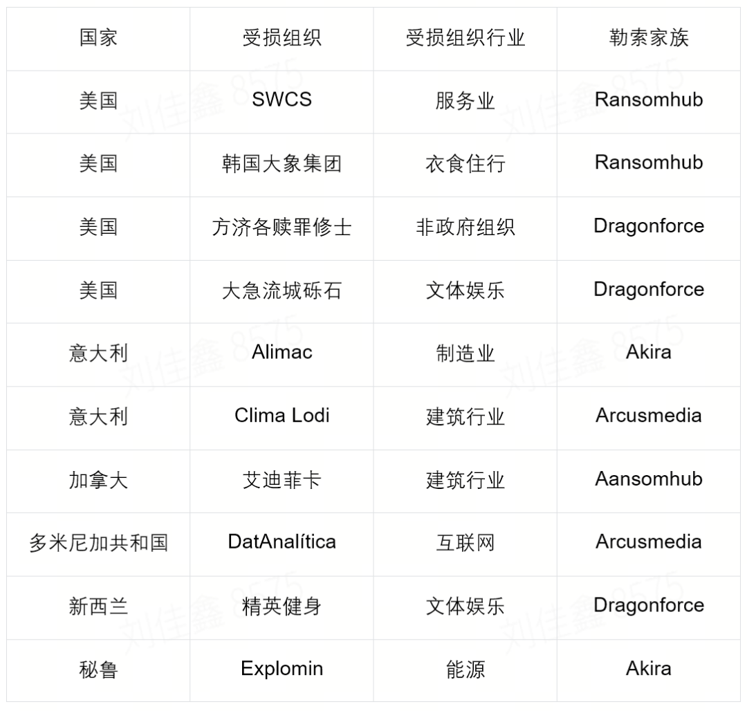 从整体上看,Lockbit3.0仍然是影响最严重的勒索家族;本周RansomHub是影响最严重的勒索家族;Akira和Dragonforce恶意家族紧随其后,需要注意防范。