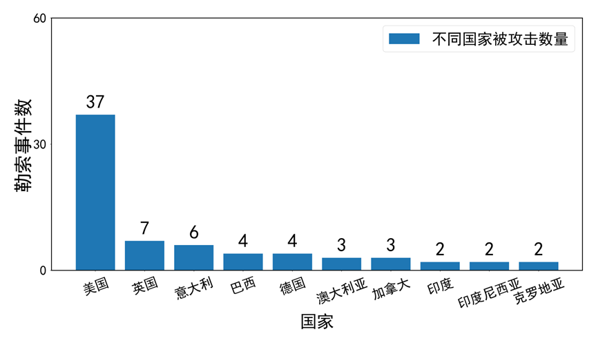本周勒索事件受害者所属国家Top10如图1.4所示。美国依旧为受勒索攻击最严重的国家,占比39%。