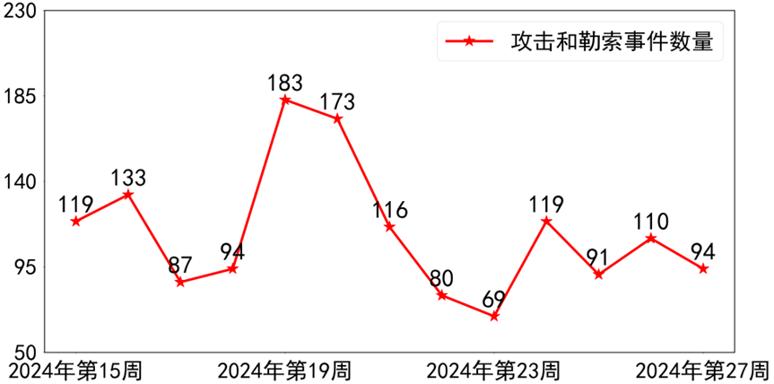 本周全球共监测到勒索事件94起,事件数量有小幅下降。勒索事件趋势见图1.1。