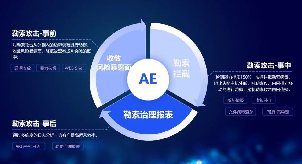 亚信安全信舷AE防毒墙,以“稳定高效,安全前移,全面防护”为理念,围绕勒索攻击“全生命周期”,完善并强化了事前、事中、事后的防御能力,打造勒索治理体系中不可或缺的第一关。