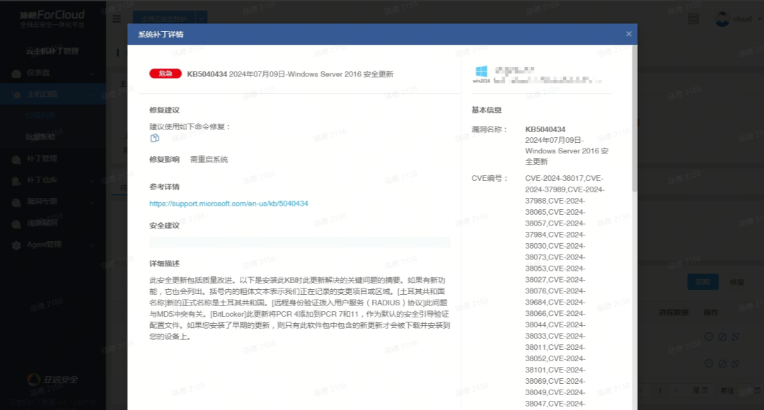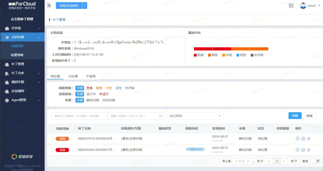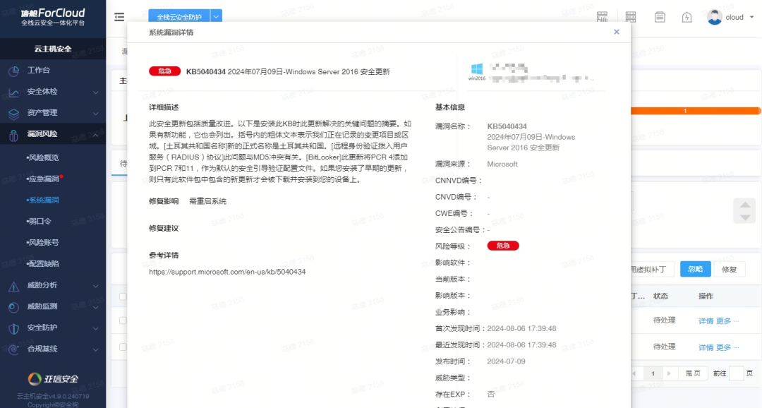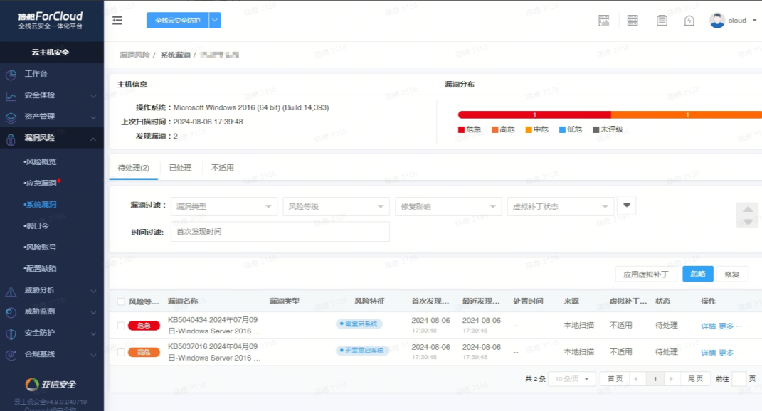 信舱ForCloud的云主机安全“系统漏洞”扫描功能支持对Windows漏洞进行扫描,帮助客户收敛攻击面。