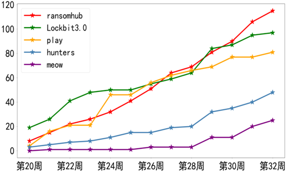 本周监控到活跃的勒索家族共有28个,Top10勒索家族如图1.5所示。本周Top3和历史Top3勒索家族的累积变化趋势如图1.6所示。从图中可知,从整体上看,Lockbit3.0依旧是影响最严重的勒索家族;本周RansomHub是影响最严重的勒索家族;Hunters、Meow恶意家族紧随其后,需要注意防范。