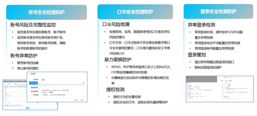 在主机侧,弱口令造成的权限风险不仅限于弱口令层面,弱口令可以看做是权限安全的单独体现。信舱ForCloud可通过对账号安全、口令安全、登录安全等对检测防护,实现账号权限风险的发现与收敛,从根本问题上处置弱口令。