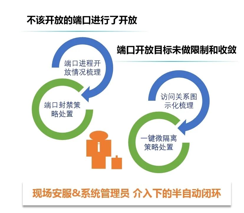 信舱ForCloud高危端口处置,对于不该开放却开放了的高危端口,信舱ForCloud可根据端口进程开放梳理情况做封禁策略处置;对于未做限制和收敛的高危端口,信舱ForCloud可根据梳理出的访问关系图,结合一键微隔离策略进行快速处置。