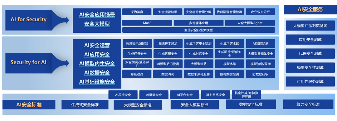 聚焦安全与发展,亚信安全探索AI与安全协同发展的无限可能。在“AI为安全”(AI For Security)方面,亚信安全主要聚焦网络安全行业垂直大模型的研发及运行,并全面覆盖其上智能体和安全应用场景的需求;在“安全为AI”(Security For AI)方面,亚信安全着力研究和保护大模型自身安全,对于AI模型内生安全、AI数据安全、AI算法脆弱性,以及大模型面临的威胁攻击提供安全支撑。