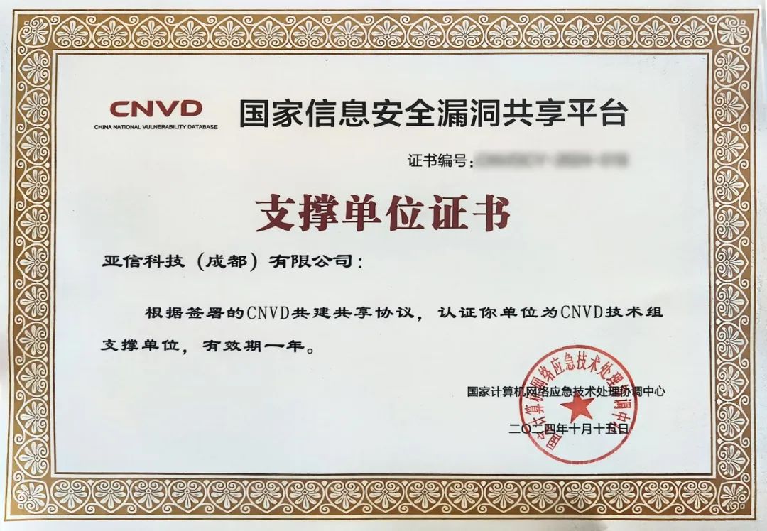 近日,国家信息安全漏洞共享平台(CNVD)依据《CNVD管理办法》及《CNVD支撑单位能力要求》,对申请加入考察期的单位进行了全面而严格的能力评估。经过层层筛选与审核,亚信安全凭借卓越的技术实力与专业的服务能力,成功脱颖而出,被正式授予CNVD技术组支撑单位称号。