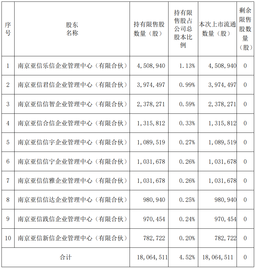 本次上市流通的限售股为公司首次公开发行的部分限售股,限售股数量为18,064,511股,占公司总股本的4.52%,限售期限为公司股份上市之日起三十六个月。本次限售股股东数量10名,该部分限售股将于2025年2月10日起上市流通。