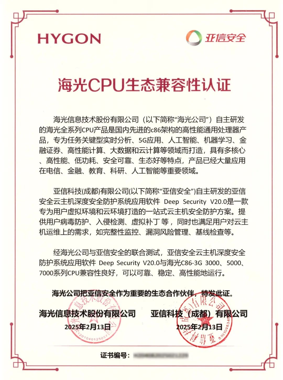 一直以来,亚信安全积极与海光公司等国产厂商加速进行兼容性测试工作,也进一步展示了国产信息化生态的协同发展日臻完善。目前,亚信安全已经与多家国产服务器/终端机厂商、操作系统厂商,包括鲲鹏、海光、飞腾、龙芯、兆芯平台及银河麒麟、统信操作系统UOS、欧拉、鸿蒙等操作系统,完成了产品兼容性适配,并将持续推进与上下游企业的协同合作,共同打造出满足用户合规需求的信息安全解决方案,携手护航产业蓬勃发展。