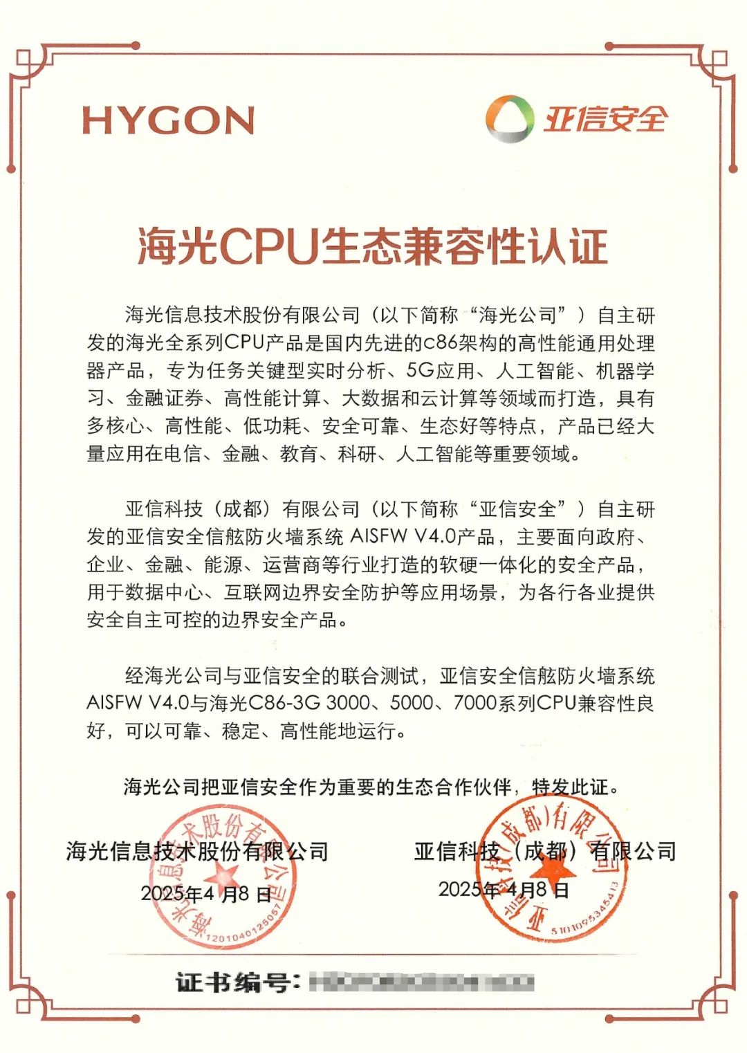 近日,亚信安全信舷防火墙系统 AISFW V4.0产品与海光C86-3G 3000、5000、7000系列产品完成兼容性适配测试。结果显示,双方产品相互良好兼容,功能性完整,性能表现优异,满足了用户功能、性能和可靠性要求。亚信安全与海光公司将在共建网络安全产业的背景下,为推动信创产业发展,加速数字化转型提供安全保障。