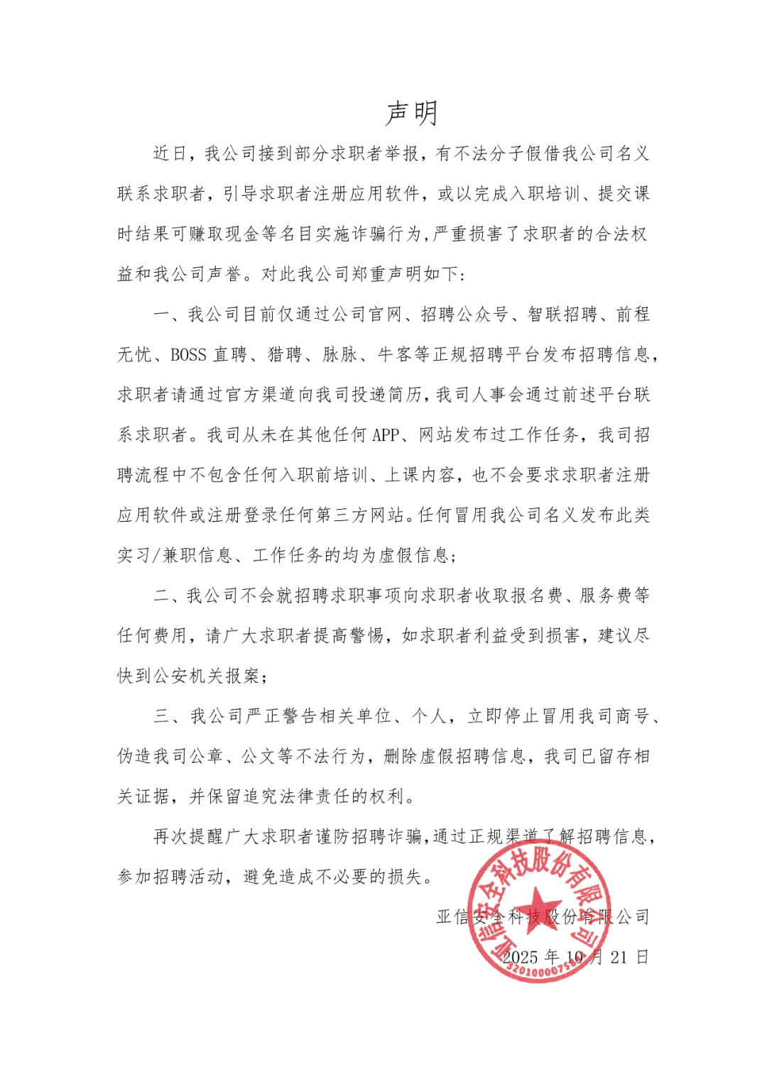 官方声明:谨防假借亚信安全名义的招聘诈骗