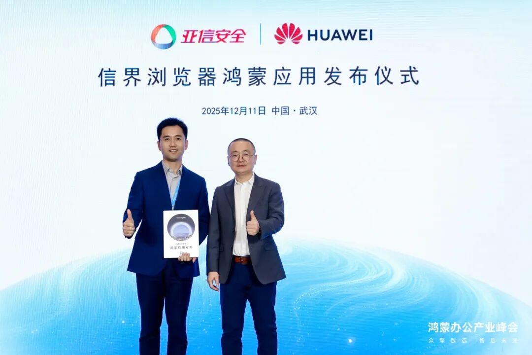 作为 华为 的重要合作伙伴和首批鸿蒙办公商用解决方案伙伴, 亚信安全 受邀出席此次峰会, 亚信安全 CMO周海涛代表公司参加峰会活动。凭借在鸿蒙生态安全领域的引领性贡献, 亚信安全 一举斩获两项殊荣: 亚信安全 新一代终端安全TrustOne与鸿蒙原生安全能力的极致深度融合,成就了用户的卓越体验,荣膺卓越体验“翘楚奖”;同时, 亚信安全 信界企业浏览器正式上架鸿蒙应用市场,成为快速落地商用场景的典范。在峰会现场现场,两款产品同步亮相,共同展示出 亚信安全 护航鸿蒙办公生态的强大实力。
