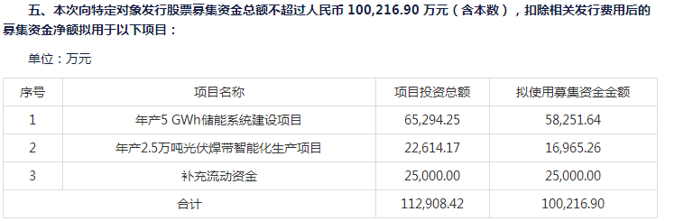 12月1日晚间,威腾电气(SH688226,股价26.30元,市值41.03亿元)披露公告,拟向不超过35名特定对象发行不超过3900万股,募资不超10.02亿元,用于年产5GWh储能系统建设项目、年产2.5万吨光伏焊带智能化生产项目、补充流动资金。