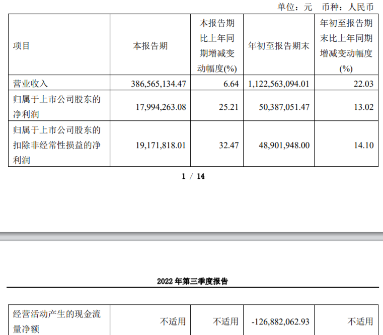 2022年前三季度,威腾电气实现营业收入11.23亿元,同比增长22.03%;归属于上市公司股东的净利润5038.71万元,同比增长13.02%;归属于上市公司股东的扣除非经常性损益的净利润4890.19万元,同比增长14.10%;经营活动产生的现金流量净额为-1.27亿元。