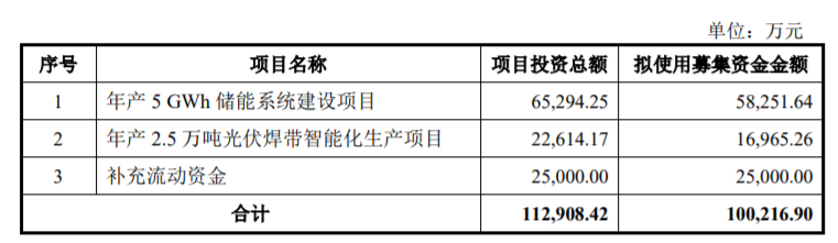 昨晚,威腾电气发布2022年度向特定对象发行A股股票预案。本次向特定对象发行股票募集资金总额不超过人民币100216.90万元(含本数),扣除相关发行费用后的募集资金净额拟用于年产5GWh储能系统建设项目、年产2.5万吨光伏焊带智能化生产项目、补充流动资金。