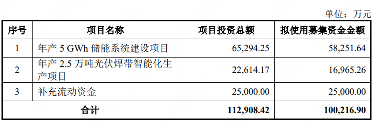 其中,约5.8亿元拟用于年产5GWh储能系统建设项目、1.7亿元拟用于年产2.5万吨光伏焊带智能化生产项目、2.5亿元拟用于补充流动资金。