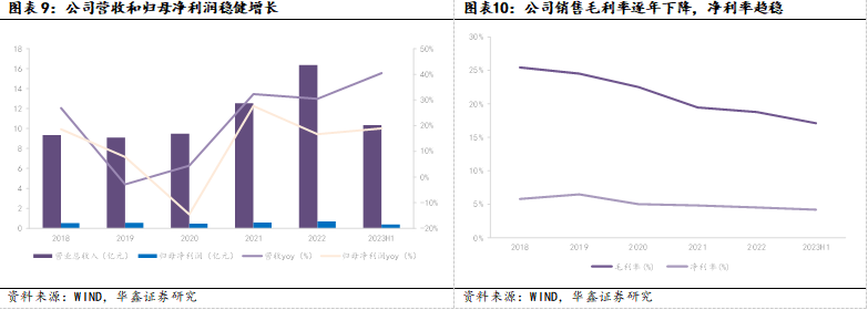 营收连年增长,业绩有望持续上升。公司近年营收规模持续增长,自2019年9.08亿上升至2022年16.36亿,对应CAGR为21.68%;2023H1实现营收10.34亿,同比增长40.48%。公司归母净利润连续3年呈上升态势,自2020年0.47亿上升至2022年0.7亿,对应CAGR为21.34%,2023H1实现归母净利润0.39亿元,同比增长18.91%。公司业绩稳步向好。