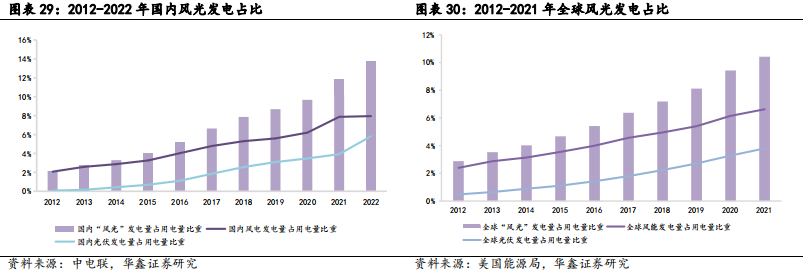 新型发电系统催生需求,储能市场空间广阔。全球已有多个国家设定碳中和目标,推动电力系统清洁低碳转型;风光能源作为如今重要发电新能源,其发电具有随机性、波动性特点,且伴随着全球风光发电比例持续上升,对电力系统稳定性和可靠性的要求越来越高,进而催生储能需求。目前,世界主要国家都将发展储能产业作为国家战略,相继推出配套政策推动储能产业发展。目前包括中国在内的全球风光发电量占比仍然较低,未来随着新能源发电占比的不断提高,储能的重要性将愈发凸显,市场空间广阔。