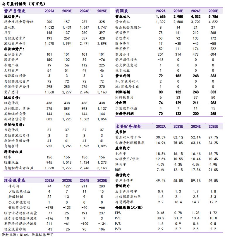 我们看好公司母线业务保持稳定,焊带以及储能业务快速放量打开增长空间,预测公司 2023-2025 年收入分别为 29.8、45.3、57.9 亿元,EPS 分别为 0.78、1.28、1.72 元(未考虑增发影响),当前股价对应 PE 分别为 21.9、13.4、10.0 倍,维持“买入”投资评级。