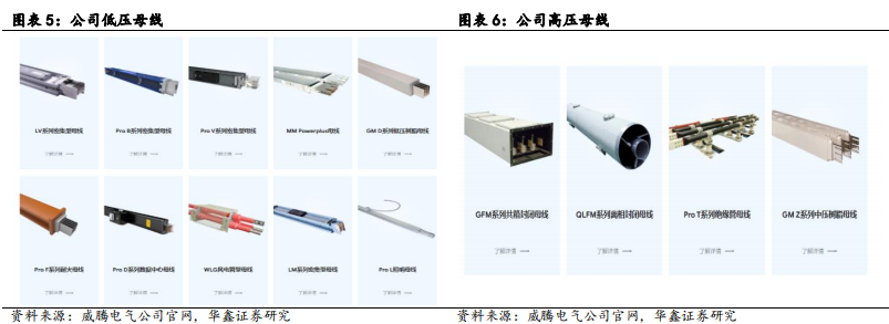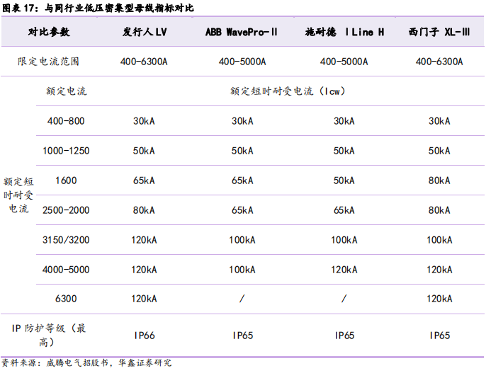 公司技术水平较高,母线产品性能优异。公司技术水平较高,在母线额定电流范围400-6300A间,威腾电气LV系列低压密集型母线产品与施耐德、西门子国内合营企业所生产的类似型号母线产品性能基本相当,甚至在部分额定电流范围内性能更优,IP防护等级也更高;公司母线产品已通过CQC、CE、KEMA、ASTA、UL等多项国内、国际权威认证,产品性能具有资质保障。公司自主研发密集型母线外壳结构及其加工工艺技术、树脂浇注母线的配方及其浇注工艺技术、母线导体全自动粉末流化涂覆工艺技术、母线插接箱结构设计与安全连锁技术、管型母线接头结构设计与连接技术、快捷式分接母线装置技术等母线核心工艺技术,目前已拥有母线系列产品专利100+项,体现出公司具备自主独立研发、设计、生产高质量高效节能母线的能力。