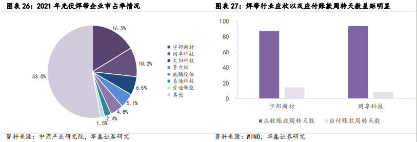 焊带行业集中度较低,资金壁垒要求高。目前国内光伏焊带生产企业约90多家,国外20余家,生产企业多为民营企业,市场化程度较充分。目前处于行业第一梯队的企业主要包括宇邦新材、同享科技、太阳科技、泰力松、威腾股份、易通科技、爱迪新能共7家;其中,龙头企业宇邦新材2021年市占率为16.5%,CR2市占率为26.7%,CR5市占率为43.1%,行业集中度相对较低。此外光伏焊带行业亦具有资金壁垒,由于光伏焊带采用的原材料为铜、锡锭等金属,所需投入流动资金较大,且下游回款周期较长,对企业的资金要求较高,具有较强融资手段的上市公司有望受益于行业市占率提升。