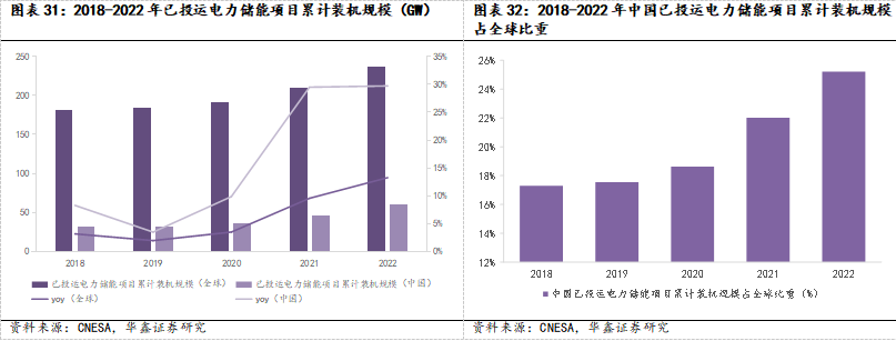 海内外储能市场规模加速上升,中国有望成为全球第一大储能市场。碳中和目标及配套政策推动储能市场规模持续扩大,2022年中国已投运电力储能项目累计装机规模达59.8GW,2018-2022年CAGR为17.57%。截至2023年6月底,我国已投运电力储能项目累计装机规模70.2GW;2022年全球已投运电力储能项目累计装机规模达237.2GW,对应2018-2022年CAGR为6.99%。全球储能市场规模呈加速上升趋势,中国储能市场规模增速显著高于全球增速,其累计装机规模占全球比重持续上升,有望超越美国成为全球第一大储能市场。