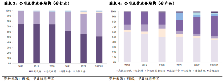公司现有配电设备、光伏新材及储能系统三大业务:配电设备业务产品包括高低压母线、中低压成套设备、智能元器件、变压器、开关柜等;光伏新材业务产品包括光伏焊带(即涂锡铜带,包含低温焊带、SMBB、黑焊带)及铝边框;储能系统业务产品包括集中式储能与分布式储能(工商业储能、户用储能及便携式储能),产品广泛应用于新能源、工业制造、电力电网、数据通讯、轨道交通、商业地产等行业。目前,配电设备及光伏新材为公司主营业务,高低压母线、光伏焊带为公司主营业务核心产品,储能系统产品自2022年开始投产销售,未来占比有望上升。