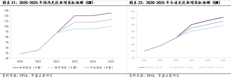 (1)光伏新增装机量:2022年国内光伏新增装机87.41GW,同比增长59.3%,全球新增光伏装机230GW,同比增长35.3%;预计2025年国内光伏新增装机达125GW,全球新增光伏装机量达386GW。光伏新增装机量持续上涨,焊带需求有望持续上升。