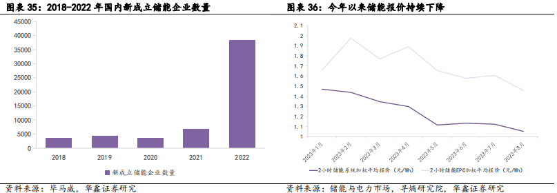 行业竞争格局复杂,报价持续下跌,储能盈利有待提升。自2022年以来,国内众多央国企、民企正向布局储能业务,储能行业竞争格局日趋复杂。入局者众多使储能市场呈充分竞争格局,价格战激烈。另一方面,目前大型储能电站经济性仍然较差,各省份之间政策差距较大,盈利能力仍然较弱。“强制配储”政策致下游追求低价以降低成本,造成劣币驱逐良币的市场乱象,这也更进一步导致储能行业盈利水平低的情况。今年以来,随着上游碳酸锂价格持续下跌,储能系统与EPC报价也快速下降,2小时储能系统加权平均报价已经从1月份的1.47元/Wh下降至8月份的1.05元/Wh,跌幅28%。