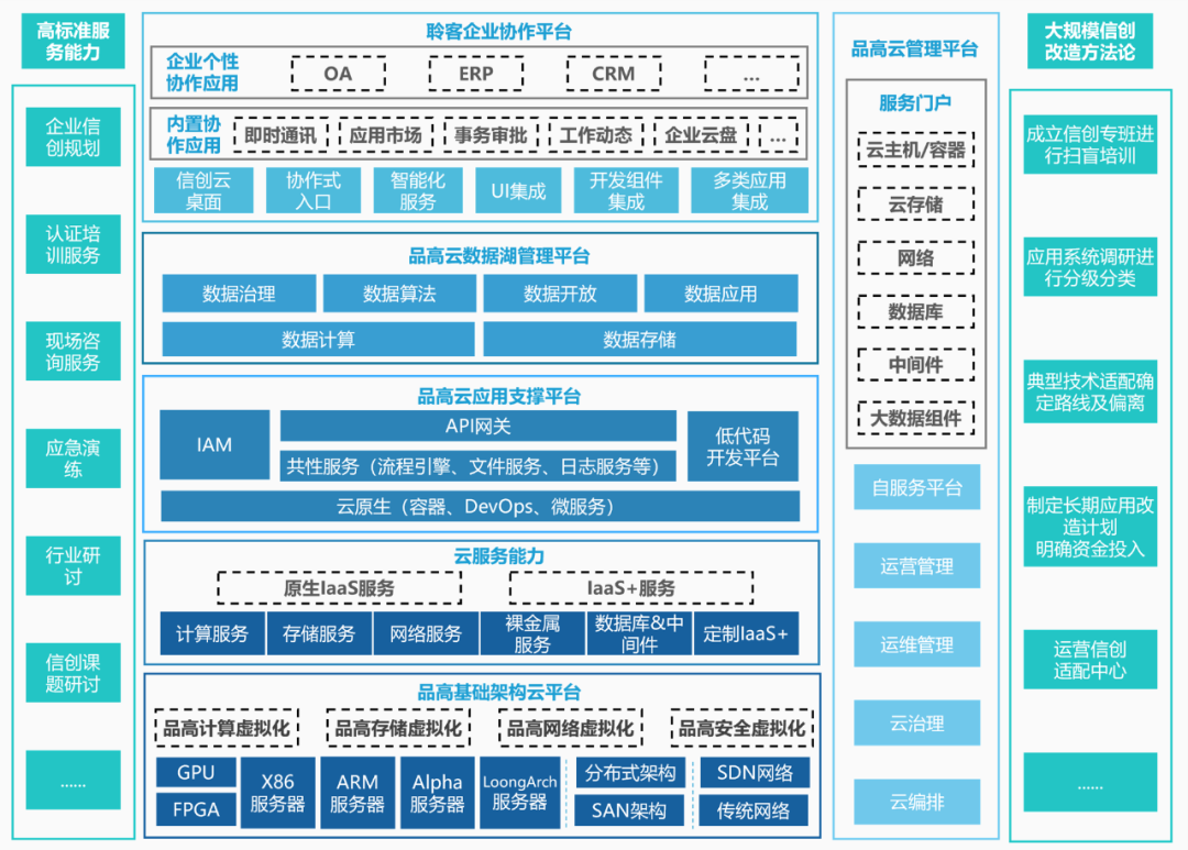 此外,品高股份在信创赛道已布局多年,是中国最早一批的信创云实践者和一云多芯、异构融合技术路线的先驱者。作为一家全栈云平台自主研发的IT企业,品高股份基于十余年成熟商用的产品和近十年的信创实战积累,不但打造了品高全栈信创云解决方案,更获得了工信部颁发的最高级别云服务成熟度认证。该解决方案覆盖IPDS(IaaS+PaaS+DaaS+SaaS)全栈层级,结合大规模行业云运营经验和经过实践检验的信创改造方法论,通过有理有据、分阶段分步骤的规划和实施,在帮助客户信创落地的同时,不断加大企业级客户信息化领域中的信创占比。目前,品高全栈信创云解决方案不单在政府,更在公安、金融、电信、轨交、教育等多个行业实现了信创技术的规模化应用,为信创的产业化发展不断探索新思路。