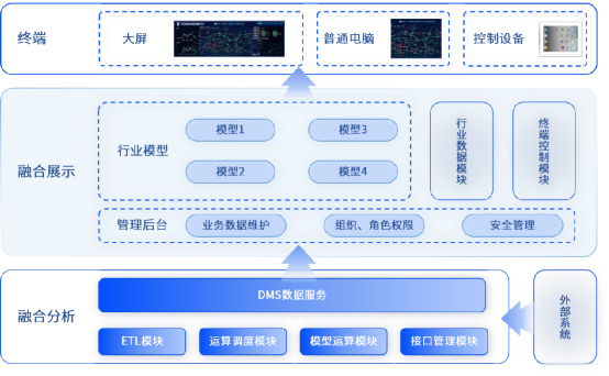 在系统架构规划方面,公司以品高云数据湖管理平台(BingoInsight)为基础,结合客户痛点,为某市政府部门进行定制化开发。平台总体由融合分析子系统、融合展示子系统以及应用展现三大块组成。其中,融合分析子系统通过数据汇聚、归整和清洗,形成可供分析的数据模型,向融合展示子系统提供数据服务。而融合展示子系统通过数据交互展示技术,实现数据资源的可视化管理。展示平台则将融合展示子系统的内容在指挥中心大屏、电脑等终端上展现,且可以通过设备进行互动控制。