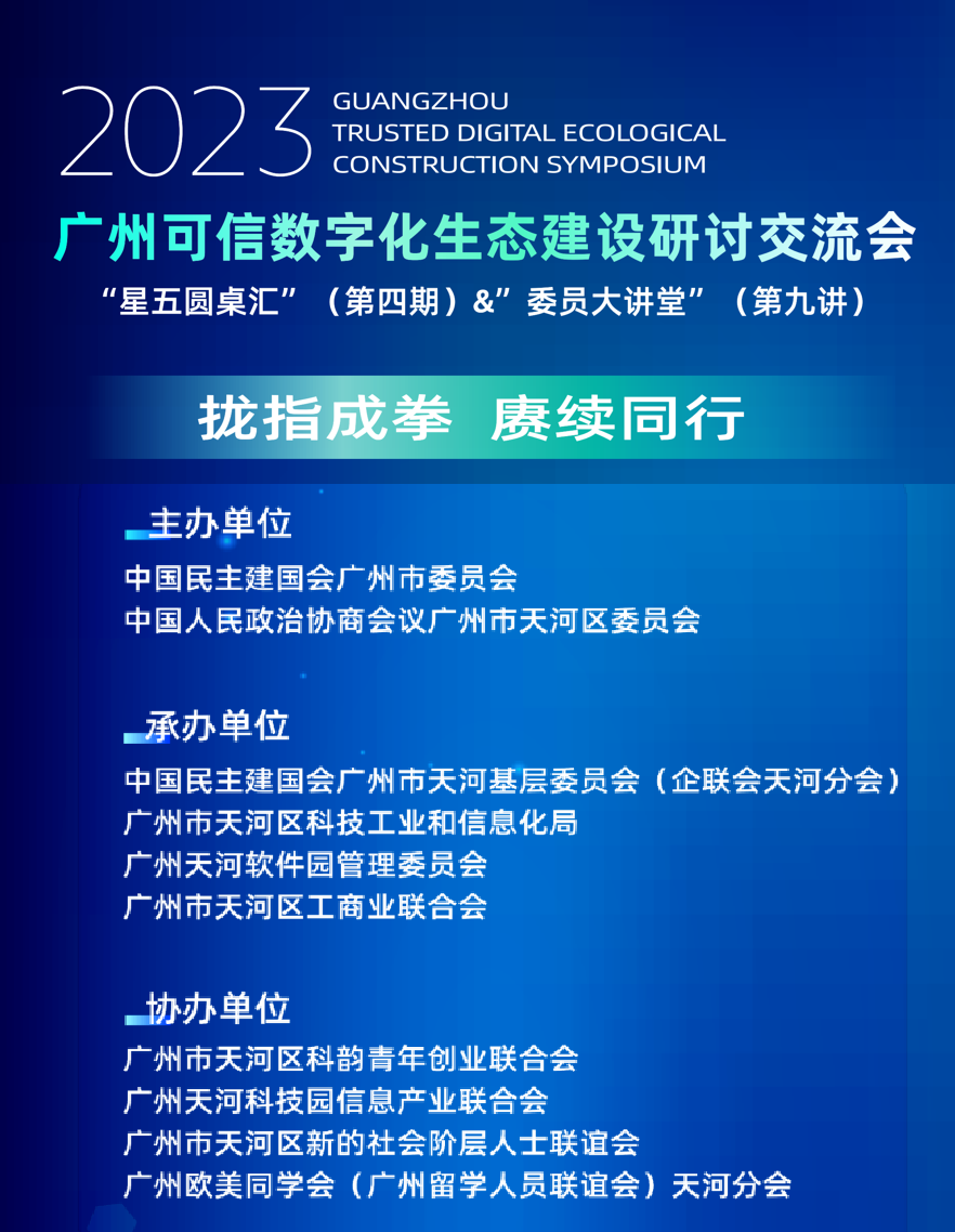 2023年9月15日上午,由中国民主建国会广州市委员会和中国人民政治协商会议广州市天河区委员会联合主办的“2023广州可信数字化生态建设研讨交流会”在广州天河科技成果转化基地成功举办。