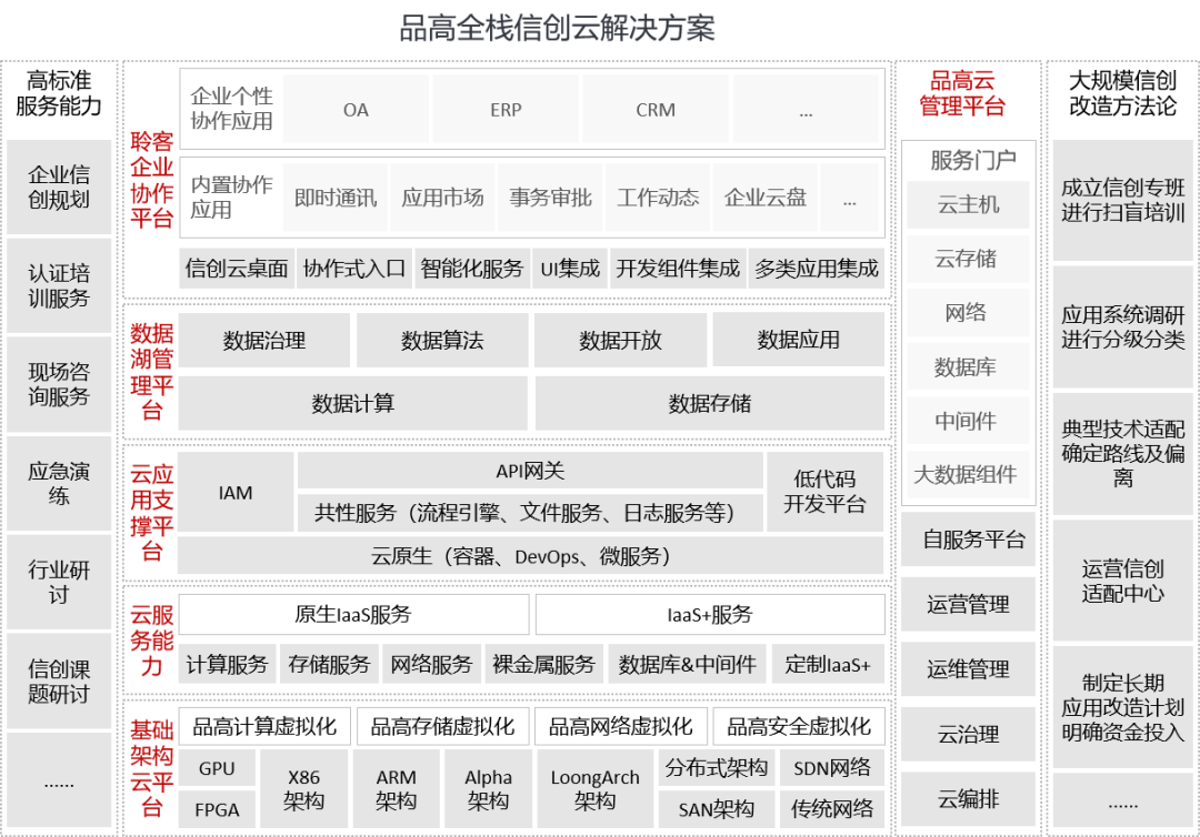 品高股份是一家全栈云平台自主研发的专业企业,基于十多年成熟商用和近十年信创技术积累的云操作系统产品打造品高信创云解决方案,结合了经过实战验证的大规模信创替代方法论和符合工信部 ITSS 最高成熟度的云服务能力,助力客户构建信创技术堆栈支撑的数字化转型基础设施。
