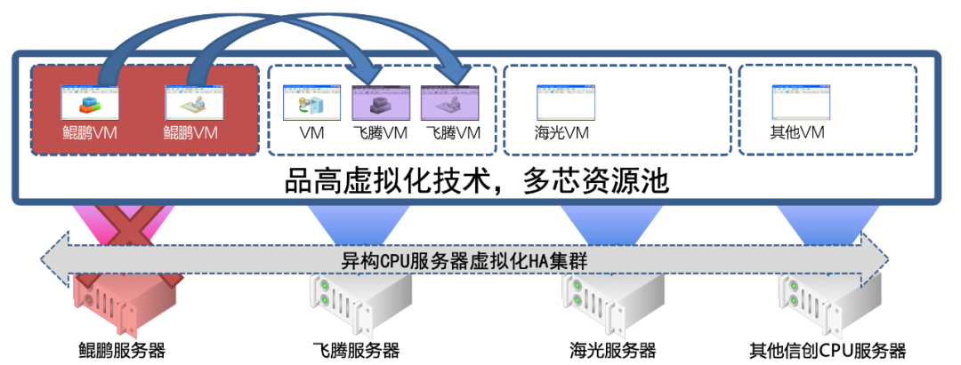 异构可靠性更高:支持全类国产型芯片的“多芯资源池”,业内首个实现跨不同信创CPU品牌的虚拟机热迁移、虚拟硬盘数据互备和虚拟分布式交换机。