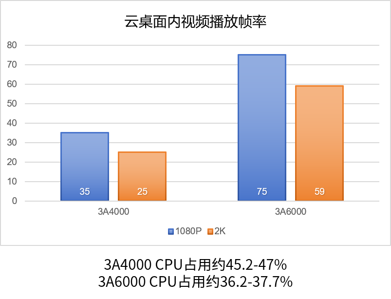分别对3A6000与3A4000平台进行图像和视频解码测试。1080P高清分辨率下,普通办公场景桌面图像帧率提升100%,视频播放帧率提升114%;2K超清分辨率下,普通办公场景桌面图像帧率提升157%,视频播放帧率提升136%。