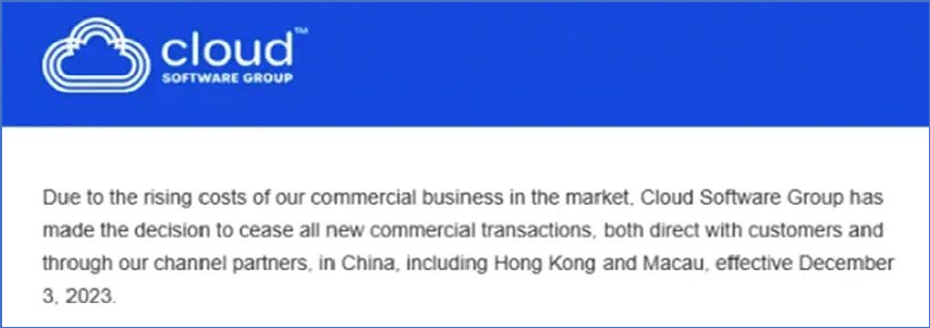 DoNews11月8日消息,美国思杰系统(Citrix System)公司宣布,因成本原因将退出中国市场,该决定于12月3日生效。思杰表示,由于业务成本越来越高,Cloud Software Group将终止在中国市场(含香港和澳门)的所有业务,包括直接与客户的交易、通过渠道伙伴的交易。