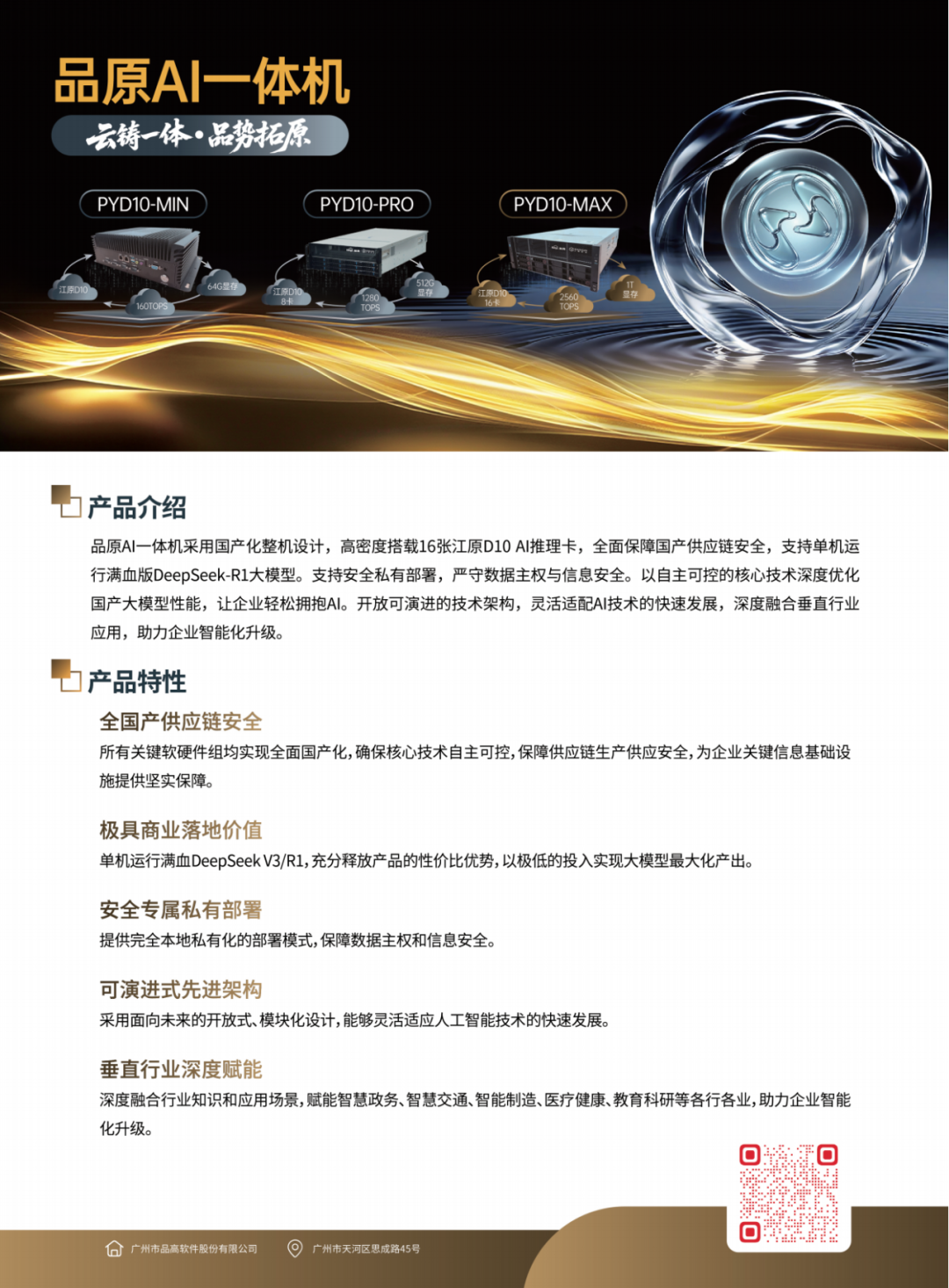 今年7月9日,公司联合国产芯片厂商江原科技推出首款全国产16卡高密度算力一体机。该产品所有关键软硬件均实现全面国产化,保障了核心技术自主可控与供应链安全,能为企业关键信息基础设施提供坚实保障。品原AI一体机深度融合江原D10芯片与品高股份在云计算及行业信息化领域的技术优势,深度赋能智慧政务、智能制造、医疗健康等多个垂直领域的智能化升级。