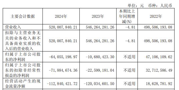 据公司2024年年报,报告期内,公司实现营业收入5.20亿元,同比减少4.81%;归属于上市公司股东的净利润-6405.52万元,上年同期为-1068.04万元;归属于上市公司股东的扣除非经常性损益的净利润-7188.47万元,上年同期为-2259.92万元;经营活动产生的现金流量净额-1.13亿元,上年同期为-1.20亿元。
