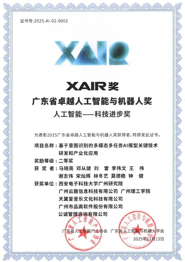 经过激烈角逐,由?州市品?软件股份有限公司联合西安电?科技?学?州研究院、?州云趣信息科技有限公司、?州理?学院、天翼爱?乐?化科技有限公司、公诚管理咨询有限公司等单位共同申报的《基于意图识别的多模态多任务AI模型关键技术研发和产业化应?》项目荣获2025年度XAIR奖“人工智能——科技进步奖”二等奖。