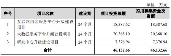 2020年3月23日,开普云发布的招股说明书显示,拟用募集资金投资额4.61亿元,将用于互联网内容服务平台升级建设项目、大数据服务平台升级建设项目、研发中心升级建设项目。