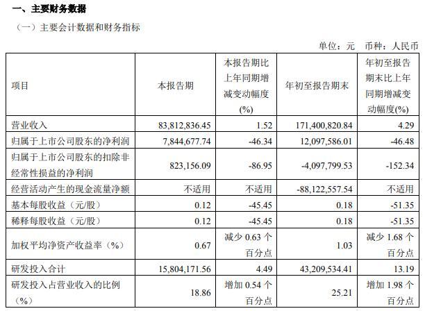 报告期内公司归属于上市公司股东的净利润12,097,586.01元,同比减少46.48%;主要系公司坚持以自主创新为核心驱动力,继续加大在研发方面的投入,同时各项费用均有上涨所致。