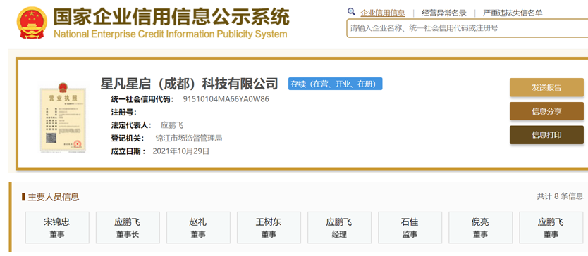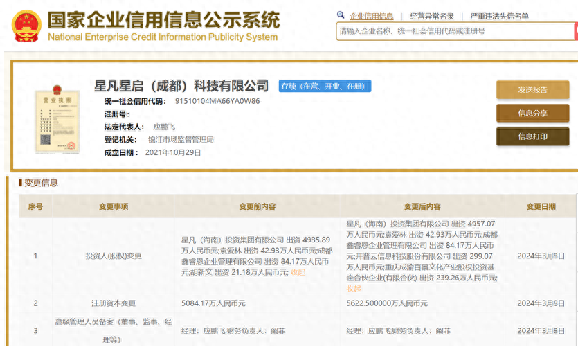 3月12日,工商信息显示,星凡星启(成都)科技有限公司(以下简称“星凡科技”)发生工商变更,新增股东开普云信息科技股份有限公司、重庆成渝百景文化产业股权投资基金合伙企业(有限合伙)。