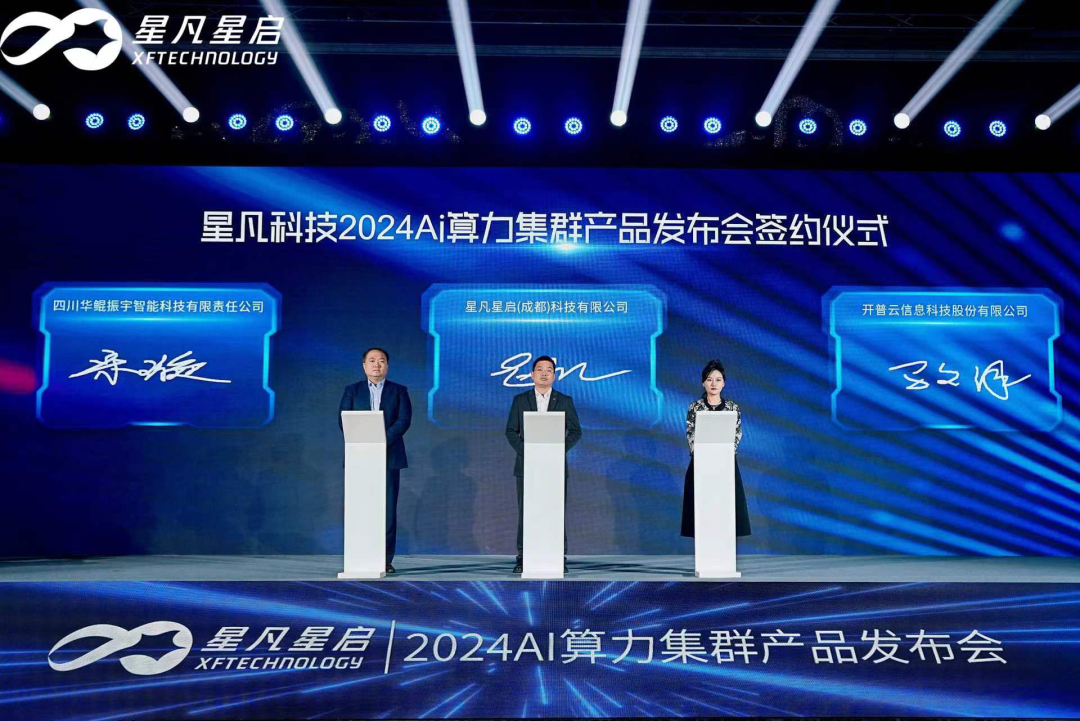在发布会上,开普云副总裁马文婧、星凡科技副总裁赵礼和四川华鲲振宇智能科技有限责任公司副总裁宋璇签署了三方战略协议,未来三方将在算力集群建设、行业大模型一体机和算力中心运营业务中进一步深入合作。