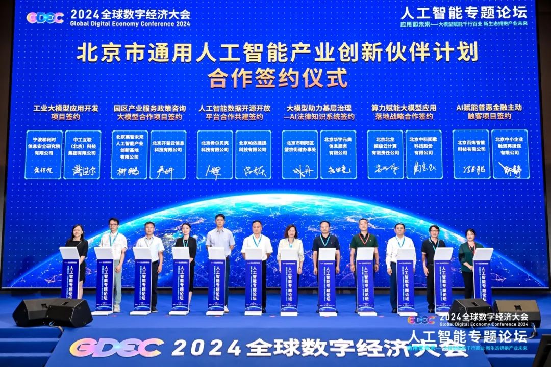 在“北京市通用人工智能产业创新伙伴计划”合作签约仪式环节,开普云与北京集智未来人工智能产业创新基地有限公司就“园区产业服务政策咨询大模型合作项目”签约。