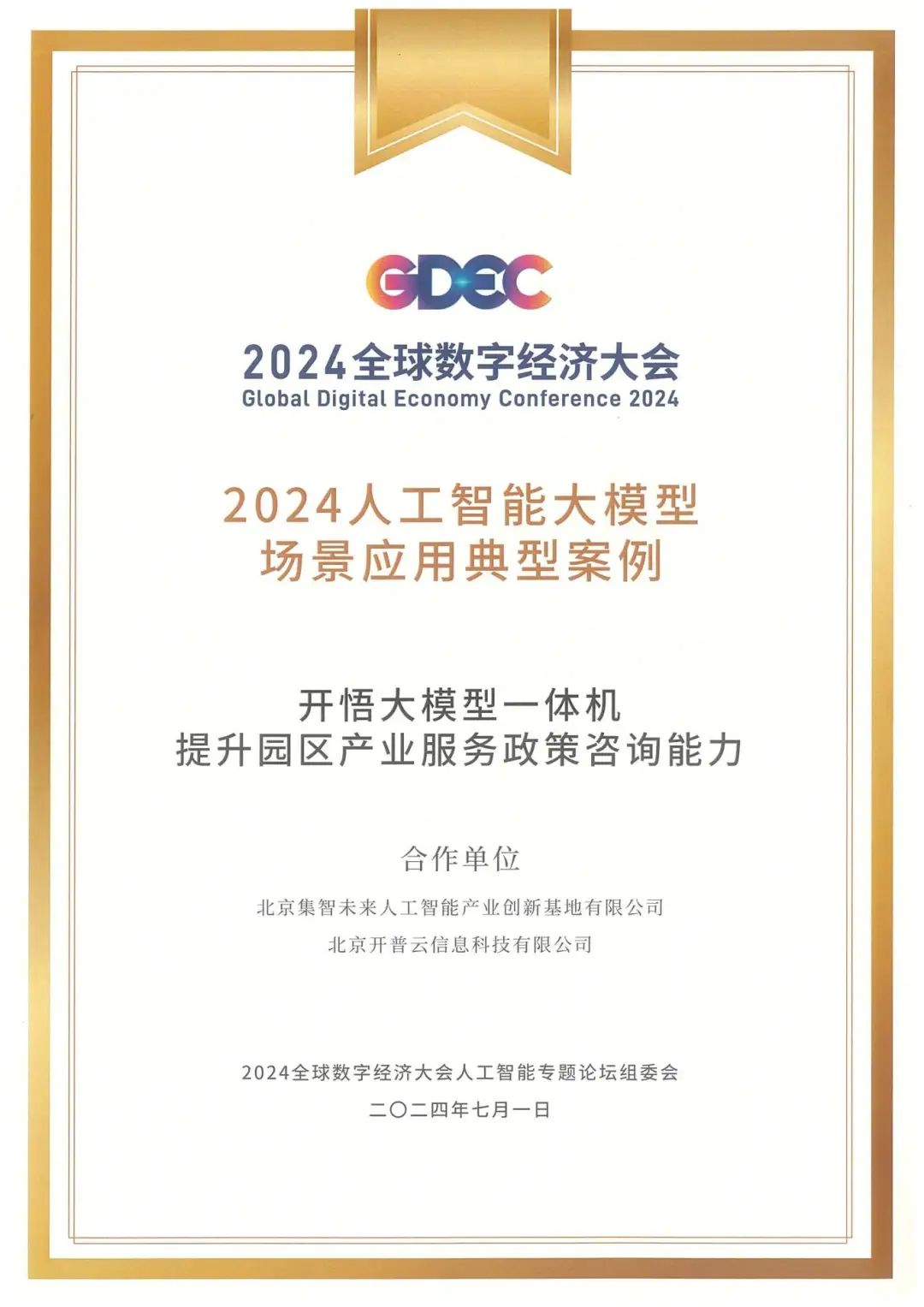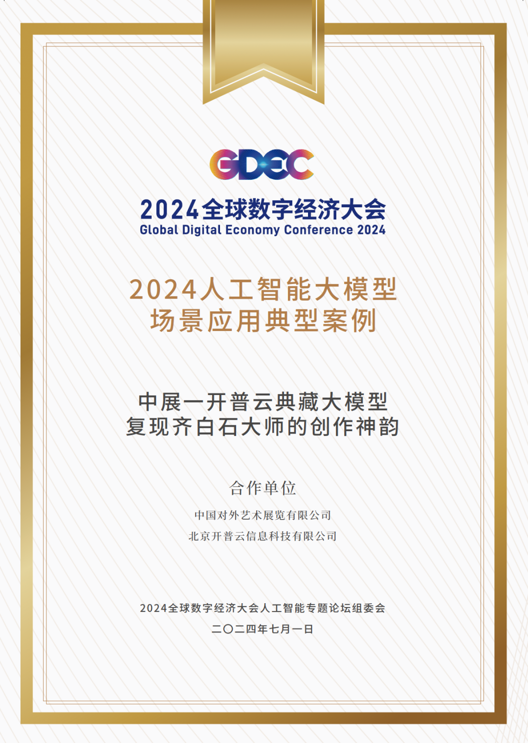 在“2024人工智能大模型场景应用典型案例”发布环节,开普云的“中展一开普云典藏大模型,复现齐白石大师的创作神韵”和“开悟大模型一体机提升园区产业服务政策咨询能力”两个案例成功入选。
