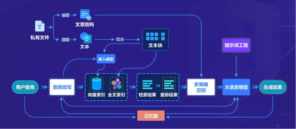 核心技术的创新是提升大模型产品竞争力的关键,“智库秘书”的良好用户体验和产品表现来自于开普云在核心AI技术的重要创新。开普云对检索增强生成(Retrieval-Augmented Generation,RAG)流程进行了深度优化,确保用户在各种复杂场景下获得最佳体验。RAG流程作为智能问答和智能写作的核心基础环节,其优化效果直接关系到系统输出的质量和效率。