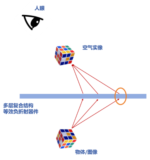 XR空气成像技术革新了传统显示设备的局限,实现了在无物理介质的情况下直接呈现动态图像,并允许用户与空中影像进行自然流畅的交互,从而深刻重塑了数字世界的互动体验。与市场上现有的技术相比,铅笔视界独创的多层复合结构等效负折射率光学器件展现出了显著优势。该器件精妙地融合了微结构层、分光层、折射率匹配层和相位延迟层,以低成本实现无介质空气成像,体积小巧且制作工艺成熟。