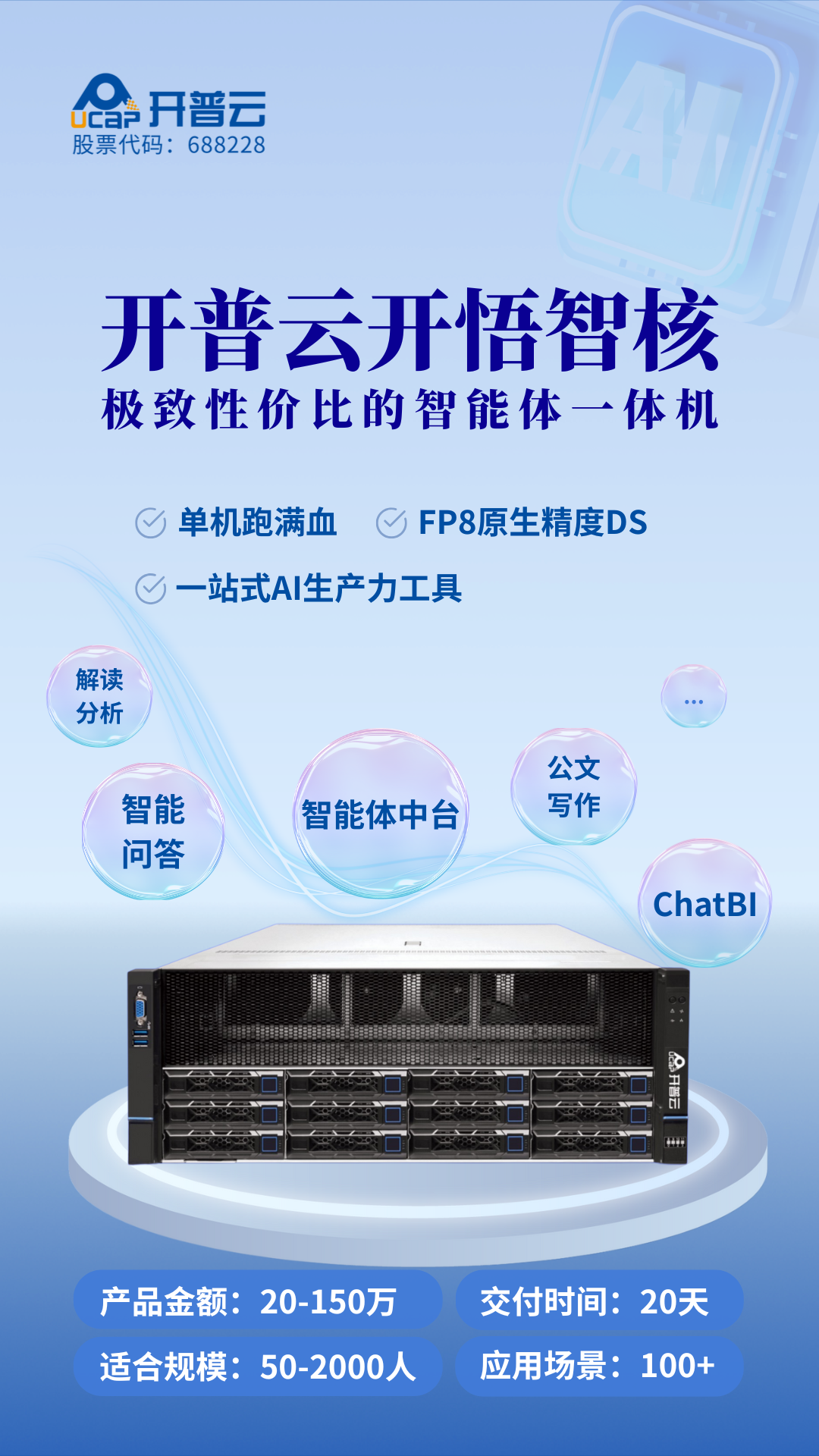 为解决上述痛点,开普云推出了极致性价比的智能体一体机——开悟智核,基于深度优化的英伟达及国产算力卡,在低功耗下提供高效能算力和超大显存,支持满血FP8精度无损版DeepSeek-V3和R1在内的各主流大模型高精度部署,内置开悟智能体平台、AI助手、ChatBI等一站式AI生产力工具,能实现快速搭建智能体应用、数据管理分析及文稿撰写、智能问答、智能检索等功能,开箱即用,是行业用户私有化安全部署高质量大模型的极致性价比方案。