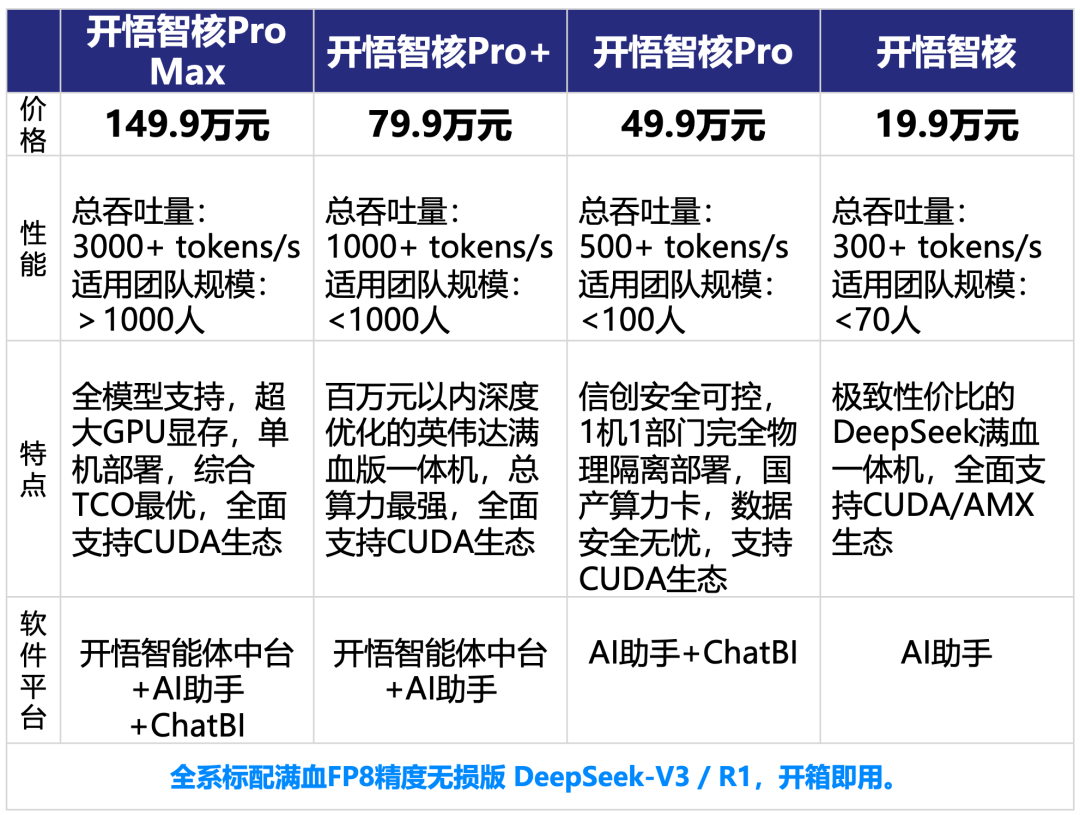 开普云深入洞察不同规模企业多样化的使用场景,推出多版本“开悟智核”产品矩阵,包括:综合总拥有成本(TCO)达到最优的“开悟智核 Pro Max”,具备最强总算力的“开悟智核 Pro+”,实现信创安全可控的“开悟智核 Pro”,以及拥有极致性价比的满血版“开悟智核”,全系标配满血FP8精度无损版 DeepSeek-V3 / R1,产品定价从19.9万-149.9万不等,以极致性价比满足用户的个性化需求。